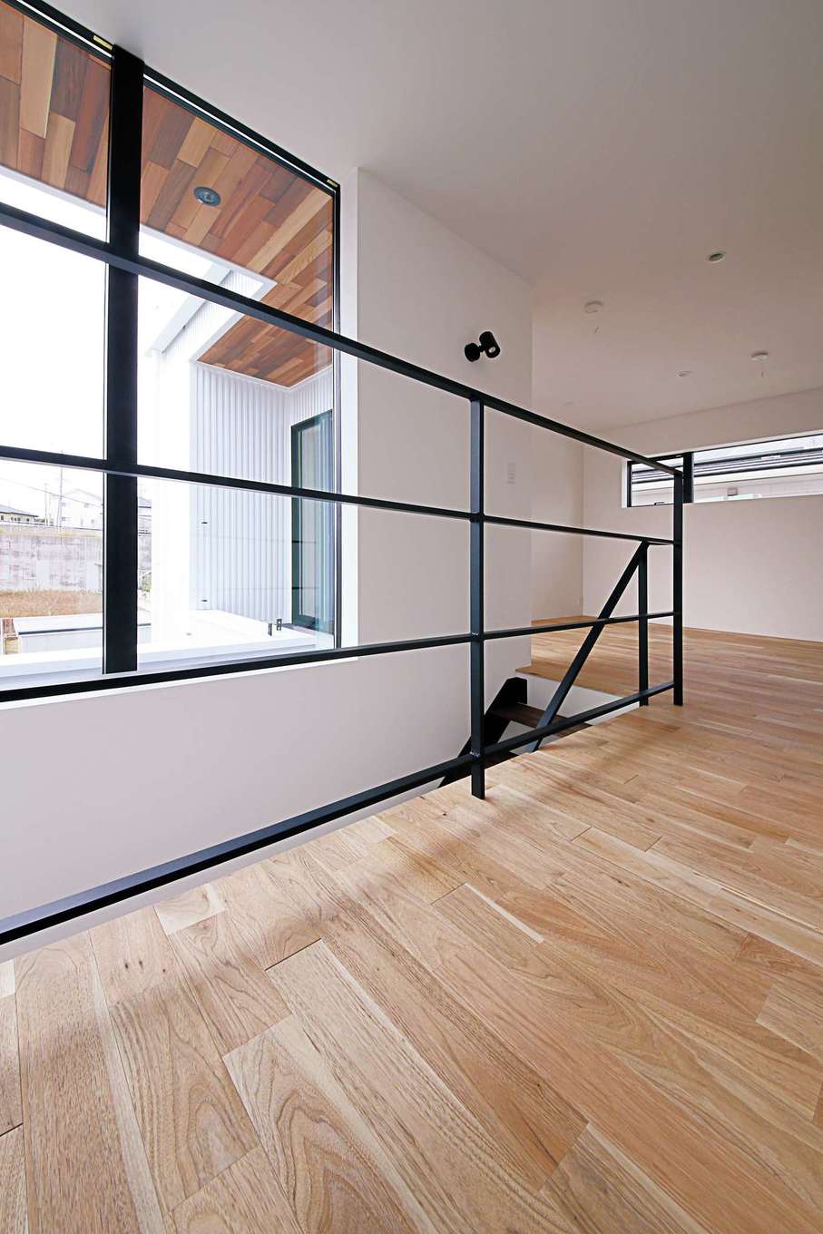 黒いアイアンの手すりのシンプルなラインが美しい階段ホール 2階の床はウォルナットのナチュラル色で統一 イエタテ