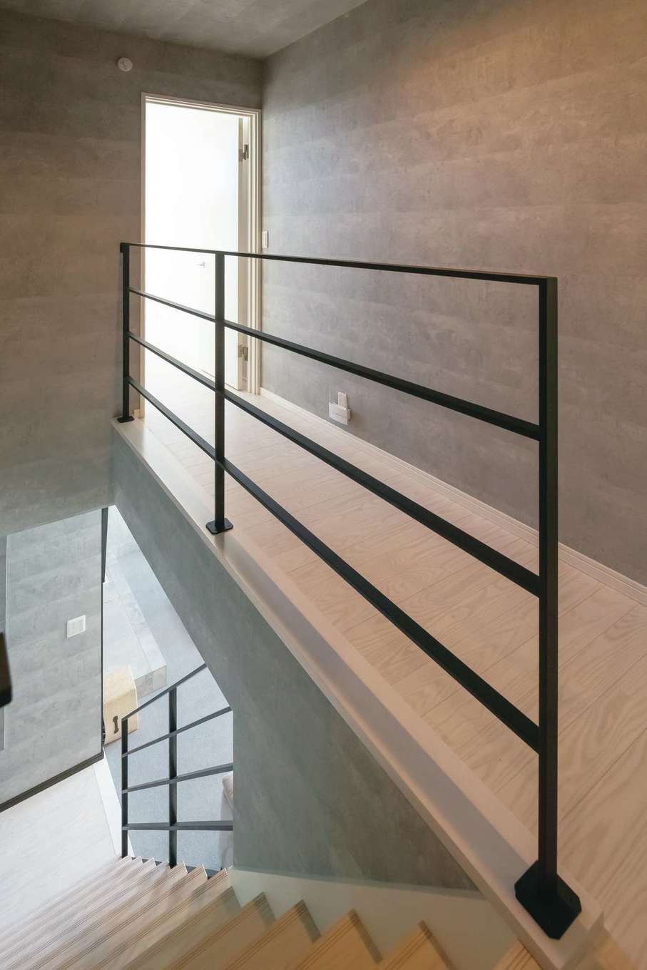 階段の吹抜け 廊下の手すりのアイアンの繊細なフォルムが洗練された空間を演出 2階の廊下も壁をグレーで統一してある イエタテ
