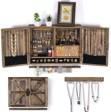 Amazon 壁掛けジュエリーオーガナイザー 素朴 壁掛けメッシュジュエリーホルダー 木製壁掛けホルダー ネックレス ブレスレット イヤリング リングホルダー アクセサリー 吊り下げジュエリーボックス ジュエリー収納 オンライン通販