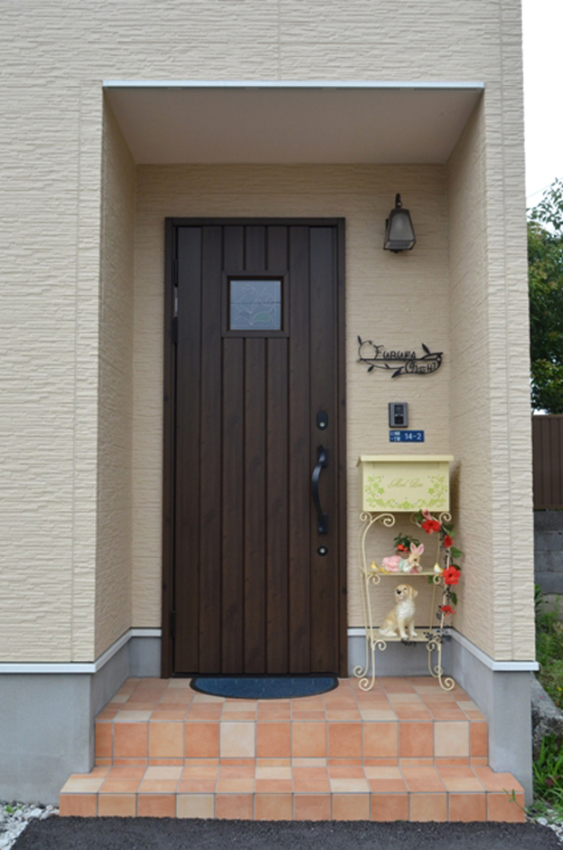玄関アプローチは濃いめのウッディなドアとアンティーク風照明を選んでカントリー風に イエタテ