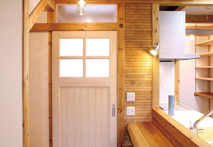 玄関に通じるドアをホワイトのカントリー調にして ウッディな広い空間にアクセントを付けた イエタテ