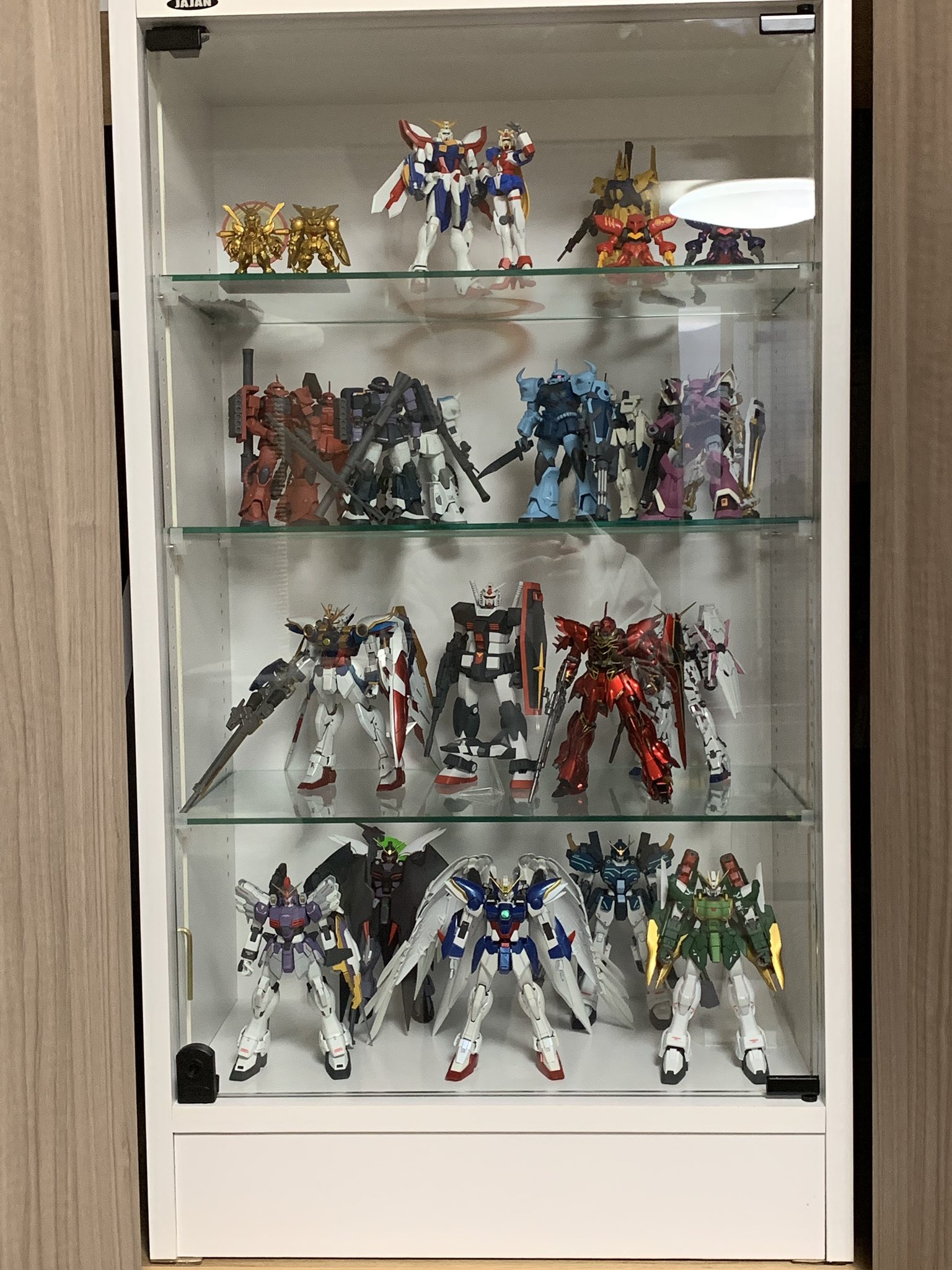 ぽてまろ A Twitter 長年の夢だったガンプラ飾り棚がついに完成 鍵付きのガラス扉だから 地震で中で倒れてパーツが外れても 行方不明にならないぜ