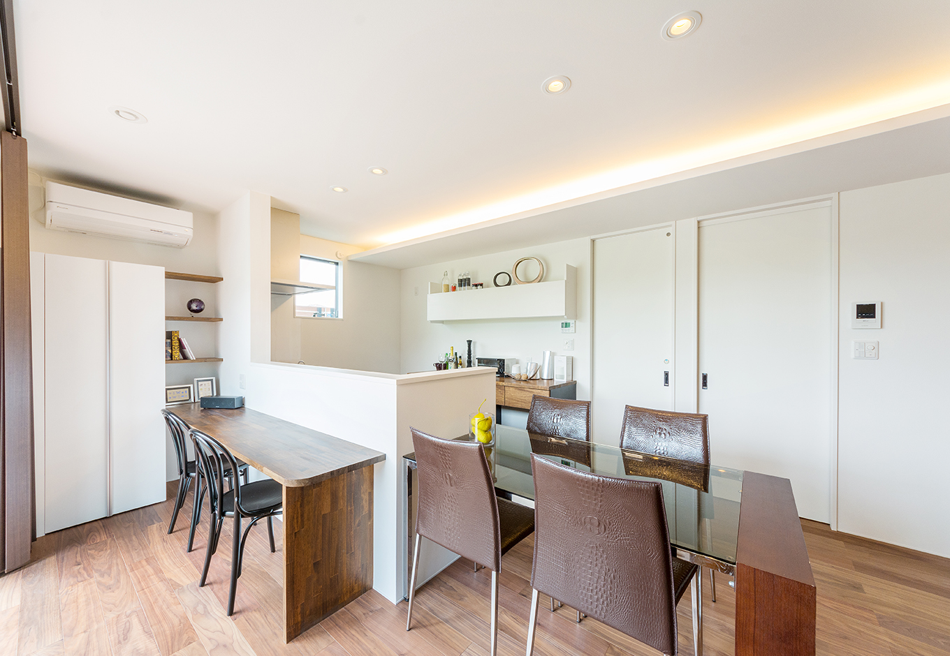 間接照明がダイニングをやさしく包む キッチンデザイン 注文住宅 ダイニング