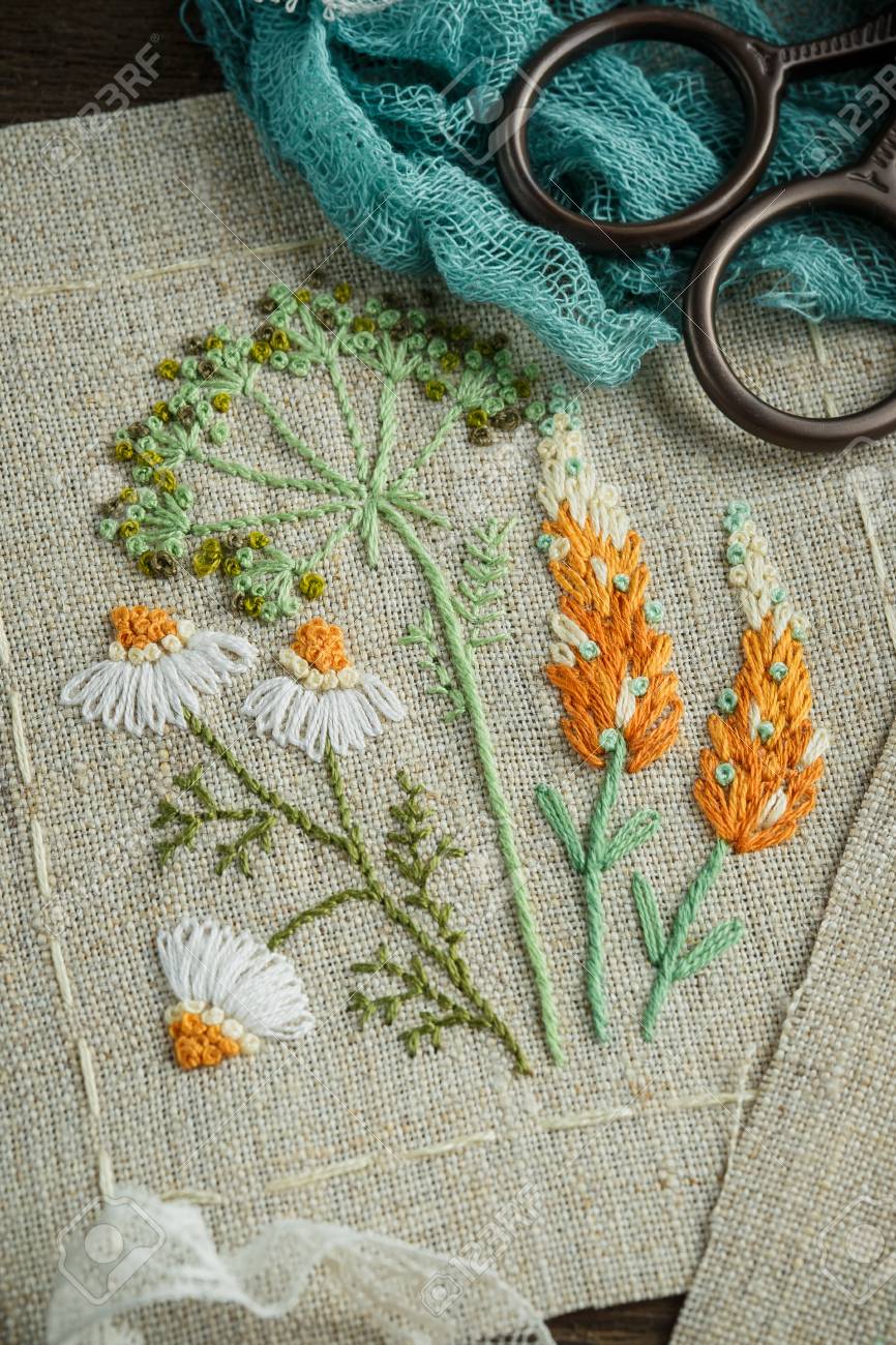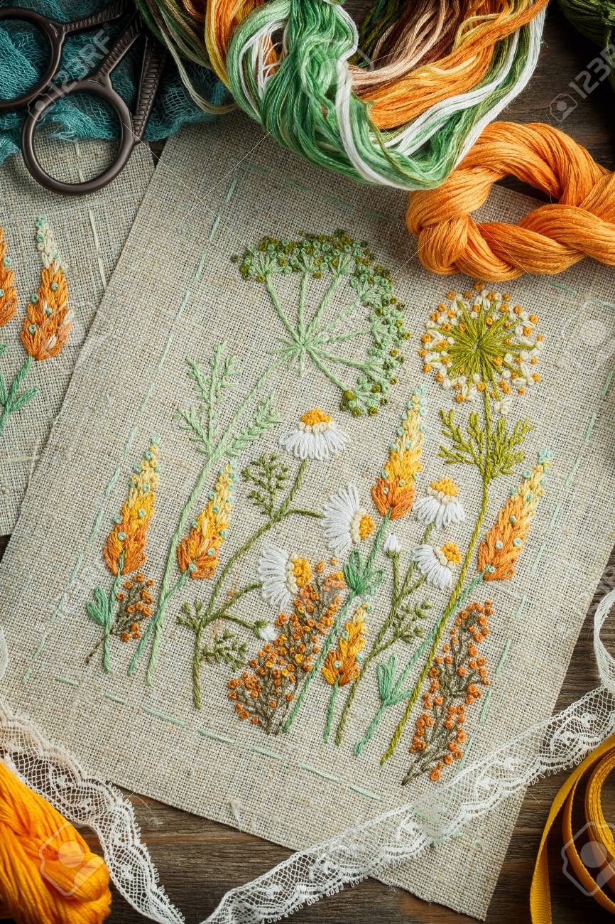 美しい刺繍作品 糸 はさみ 木製の背景に木製のフープ の写真素材 画像素材 Image 85537951