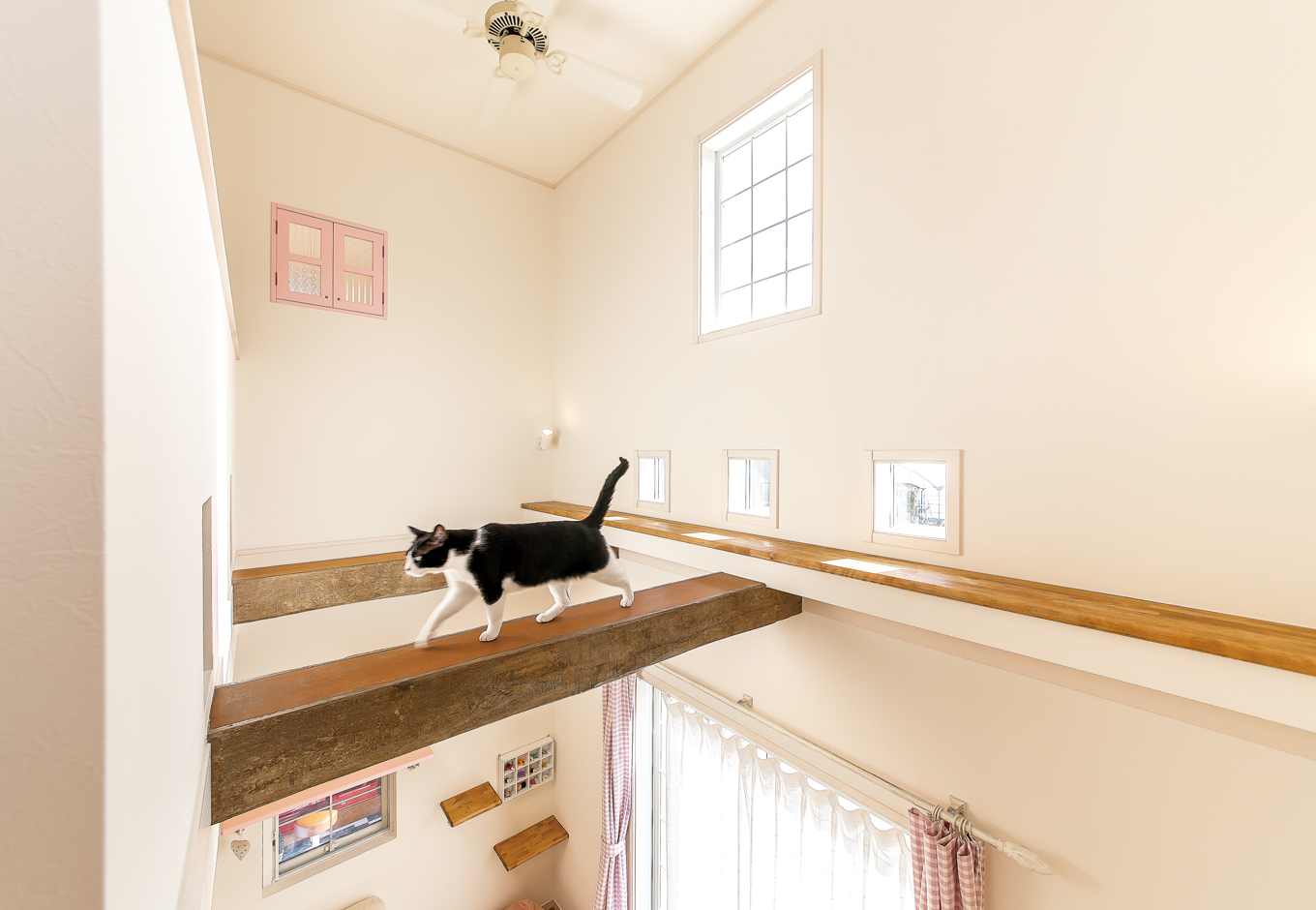 吹き抜けにキャットウォーク 設置の猫も楽しい明るいお家 施工実例 グリスマ ちょうどいい のに すごくいい 光熱費がかからないお手ごろサイズなecoなおうち