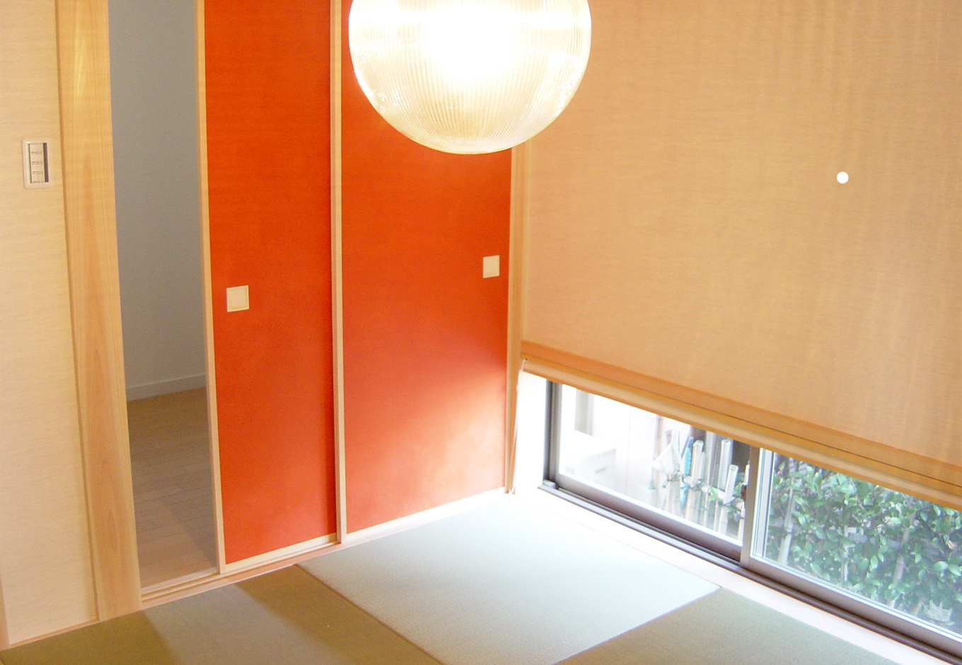 小上がりの畳スペースが広がる和室も 小窓を設けて庭を感じる造りに 温かみある照明の光がよく映える オレンジ色の襖の向こうには 収納力抜群の納