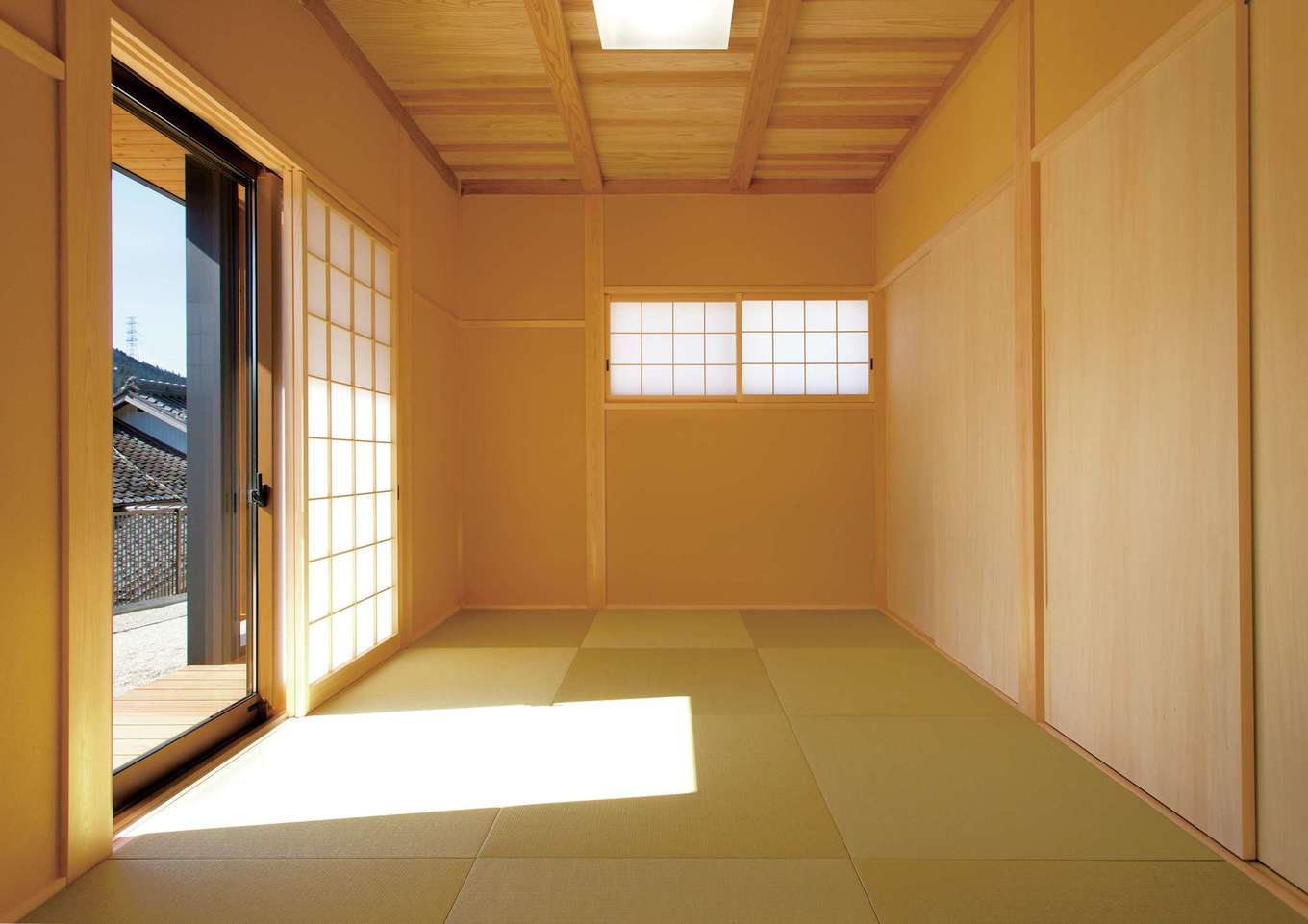 和室は吊り押入れ 地窓を採用したことで目線が抜け 4 5畳よりも広く感じられる イエタテ