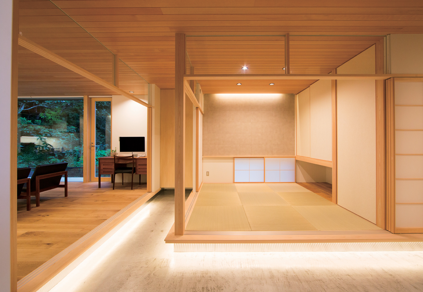 和室とダイニングの下には間接照明を 夜は まるで浮かび上がっているかのように幻想的 イエタテ