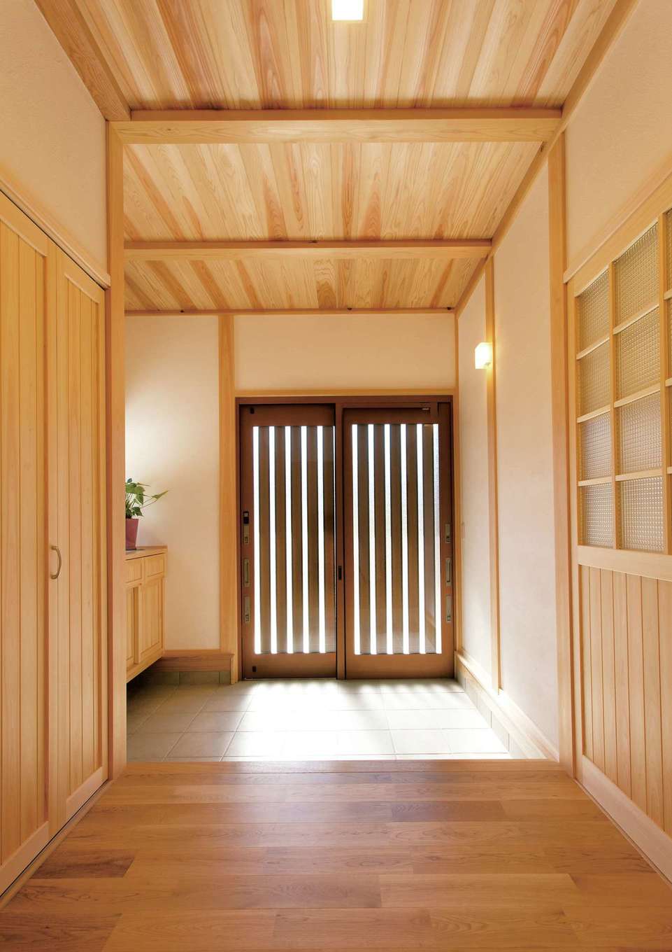 玄関は純和風 差し込む光が木を照らし とても明るい空間になった イエタテ