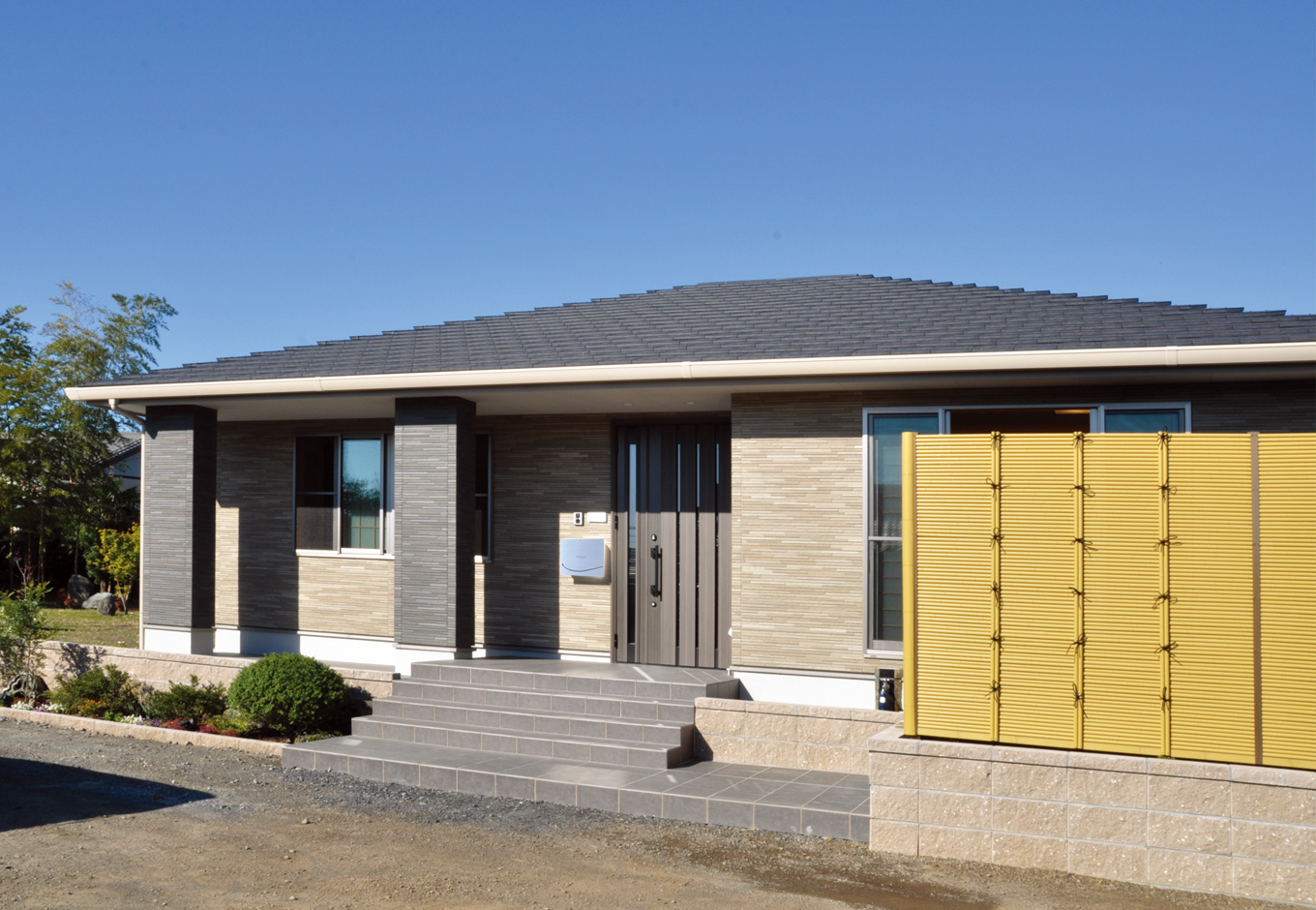 落ち着いた色合いの重厚感のある平屋 玄関周りが広くゆったりとしているため とてもスッキリとした印象だ イエタテ