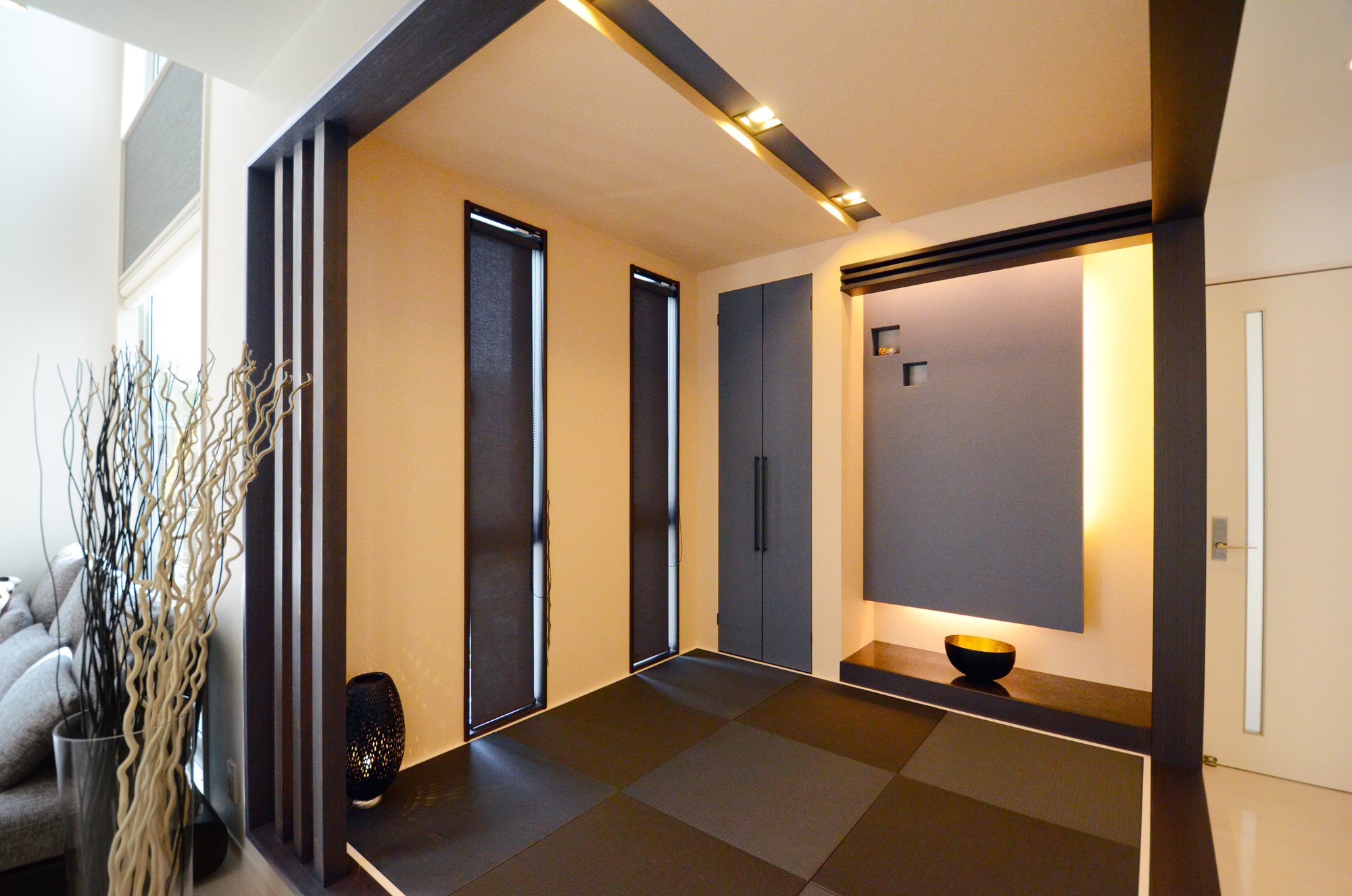 間接照明を組み込んだ床の間 黒い畳 天井の折り上げ造作など 高いデザイン性を感じさせる畳コーナー イエタテ
