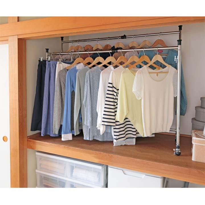 楽天市場 押入れ収納 つっぱりクローゼットハンガー 幅70 120cm 伸縮 2台セット ハンガー 突っ張り式収納 突ぱり 衣類収納 ハンガーラック ジャケット ハンガーバー 衣類収納 収納 リビングート 楽天市場店