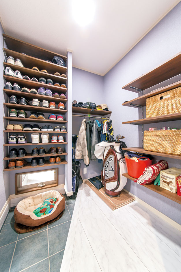 玄関横の収納スペース 靴やゴルフ道具など 持っているものに合わせて収納棚の大きさや高さなどを調整した イエタテ