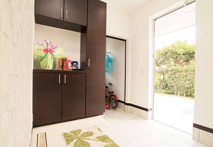 玄関には靴箱とは別に土間収納も設け 三輪車やベビーカーも家の中にサッとしまえる イエタテ