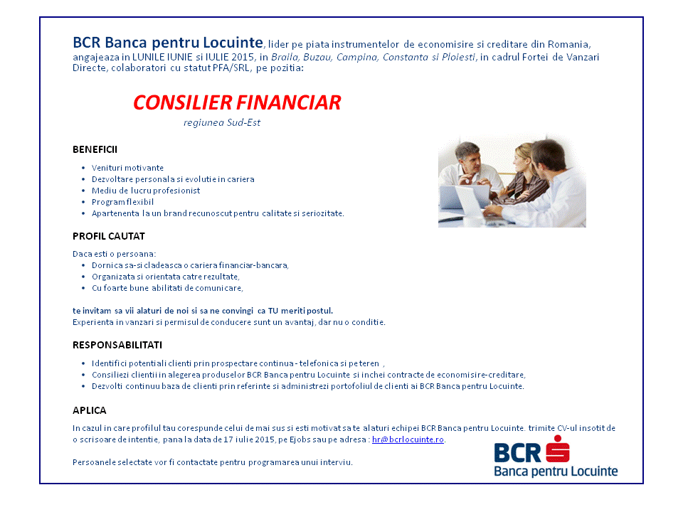 Bcr banca pentru locuinte consilier financiar. R n nde aceea noi bcr banca pentru locuinţe ne aşteptăm de la tine r n n să identifici clienţii potenţiali pentru. Bcr banca pentru locuinte economisire creditare. Bcr banca pentru locuinţe este cel mai mare jucător din sistemul de economisire creditare din românia având circa 200 000 de clienţi în prezent. Reprezintă un proiect nou şi ambiţios al bcr şi s bausparkasse austria.