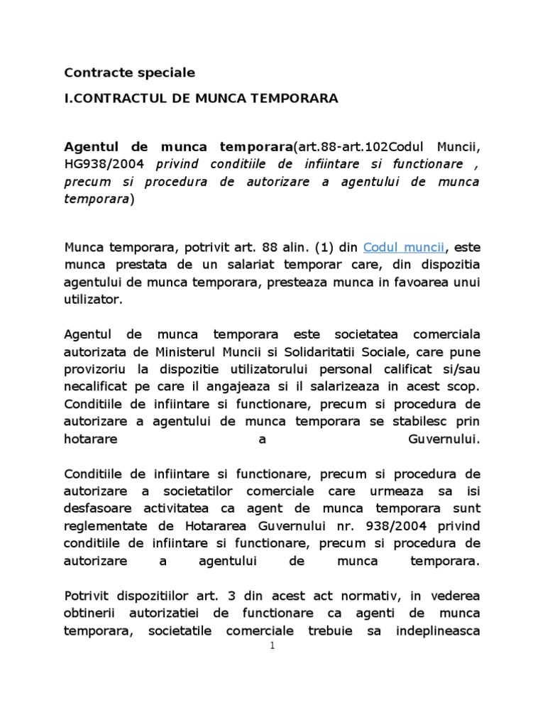 Incheiere contract de munca. Cazurile de incheiere a contractului individual de munca pe durata determinata contractul individual de munca poate fi incheiat pentru o durata determinata numai in urmatoarele cazuri. Contractul individual de munca se incheie in baza consimtamantului partilor in forma scrisa in limba romana anterior inceperii activitatii de catre salariat. 1 la incheierea contractului individual de munca sau pe parcursul executarii acestuia partile pot negocia si cuprinde in contract o clauza de neconcurenta prin care salariatul sa fie obligat ca dupa incetarea contractului sa nu presteze in interes propriu sau al unui tert o activitate care se afla in concurenta cu cea prestata la angajatorul sau in schimbul unei indemnizatii de neconcurenta lunare pe care angajatorul se obliga sa o plateasca pe toata perioada de neconcurenta. Intre categoriile sociale ale salariatilor si patronilor legislatia muncii din tara noastra prevede incheierea a doua categorii de contracte.