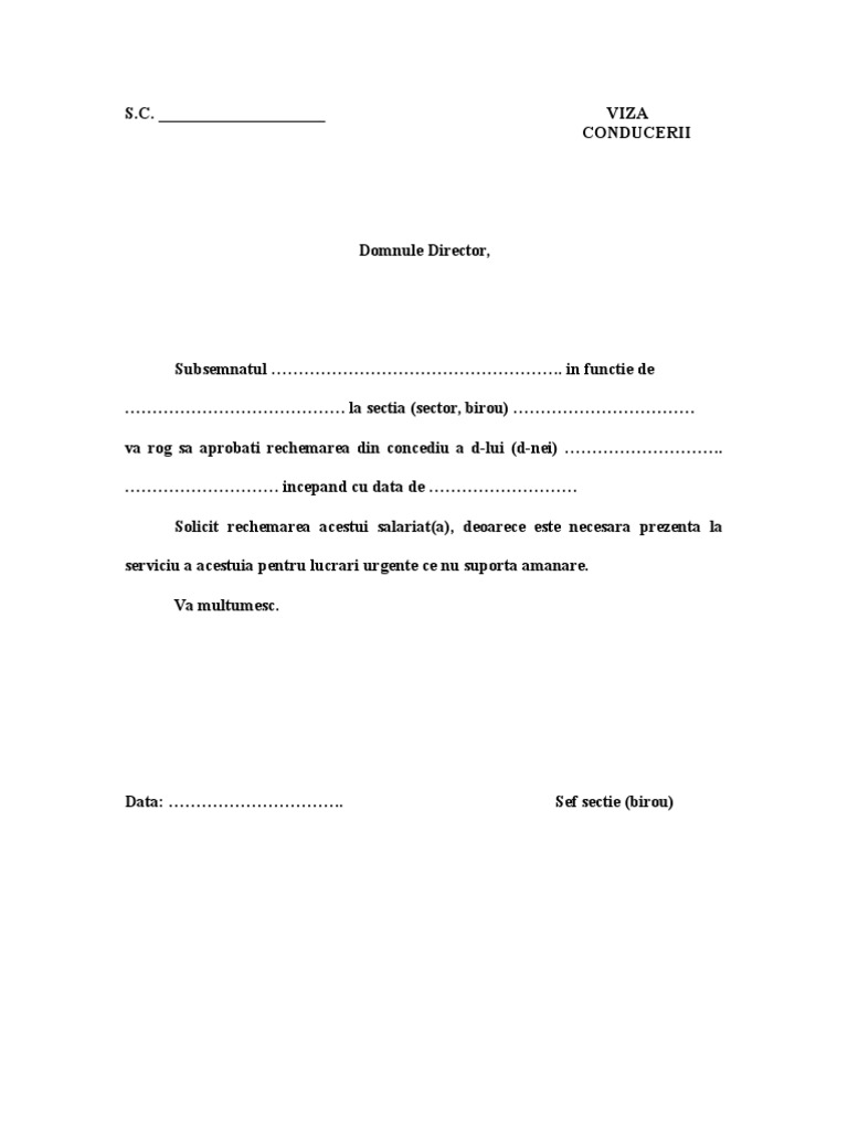 Cererea de concediu de odihna este documentul prin care angajatul. Slideshare uses cookies to improve functionality and performance and to provide you with relevant advertising. Cerere de rechemare din concediu. Use the download button below or simple online reader.