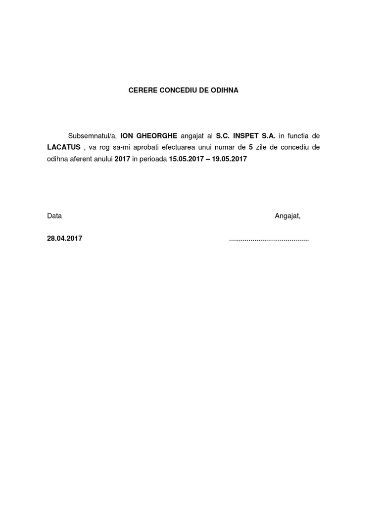 Este de preferat sa se mentioneze in respectiva cerere de concediu si numele persoanei care va inlocui salariatul absent pe durata lipsei sale de la birou. La care are dreptul in urma programarii care s a facut la inceputul anului. Va prezentam un model de cerere de concediu de odihna extras din lucrarea dosarul personal al salariatului acte modele si formulare necesare actualizata la zi unde gasiti actele care ar trebui sa se regaseasca in dosarul personal al salariatului dar si 54 de modele si formulare necesare cu indicatii pentru completarea lor. Un model cerere concediu de odihna trebuie sa contina pe langa datele angajatului perioada pentru care se face solicitarea.
